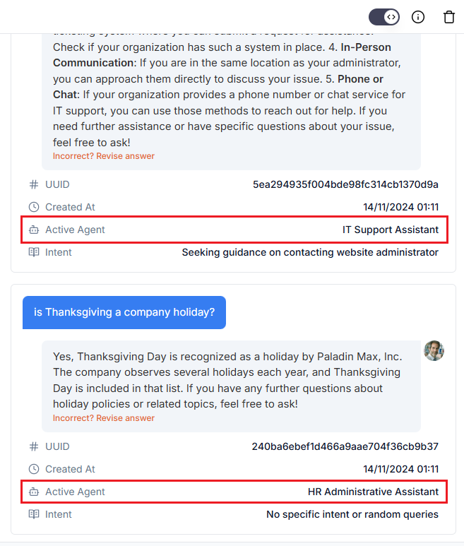 Wenn mehrere User-facing Agents vorhanden sind, werden im Debug-Modus Intent und Active Agent bei jeder Anfrage angezeigt.
