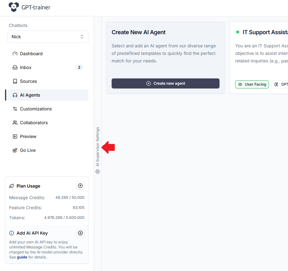Der KI-Supervisor nutzt diese Intents direkt, um die jeweilige Spezialisierung eines Agenten einzuordnen. Um Agenten-Intents fein abzustimmen, gehen Sie zum Tab KI Agents in der linken Navigation und klicken Sie dann auf KI Supervisor Settings: