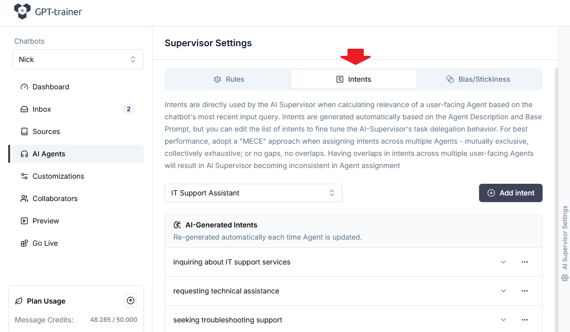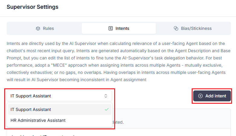 Wenn ein Nutzer eine Anfrage stellt und mehrere KI-Agenten aktiv sind, extrahiert der KI Supervisor den Intent und sucht den besten passenden Agenten. Um neue Intents hinzuzufügen, wählen Sie den Agenten aus, den Sie feinabstimmen möchten, und klicken Sie auf Add intent.