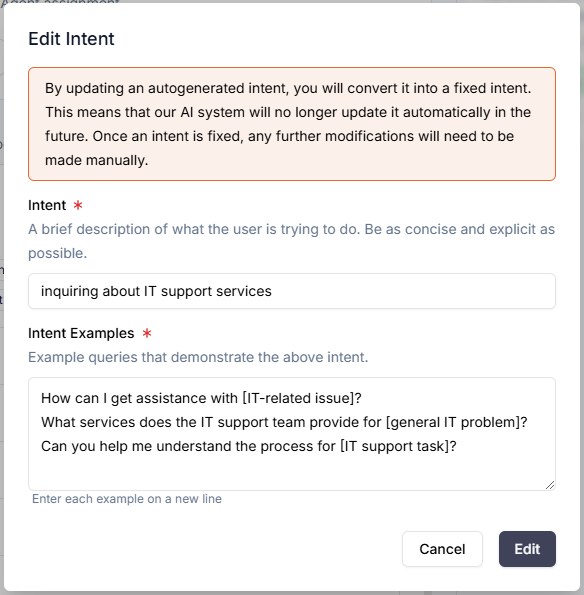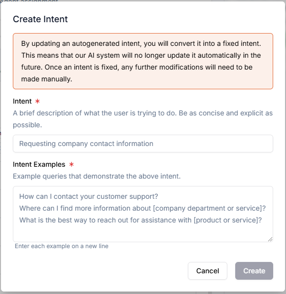 Trotzdem gibt es immer Szenarien, in denen die Agentenbeschreibungen nicht alle Fälle ausreichend abdecken. Wenn AI-Agenten erstellt oder bearbeitet werden, generiert INNOCHAT automatisch mehrere Intents sowie Beispielanfragen, die dem AI Supervisor als Referenz dienen.