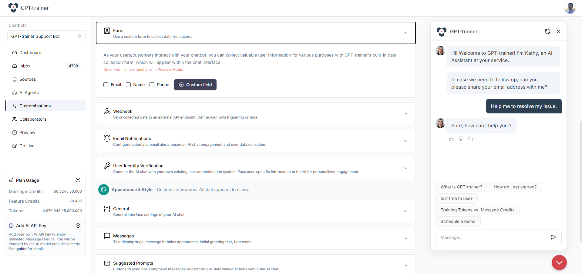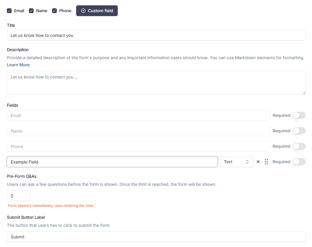 Um Ihrem AI-Chat ein Formular hinzuzufuegen, gehen Sie zum Tab Customizations im linken Navigationsmenue und scrollen Sie nach unten zum Abschnitt Form: