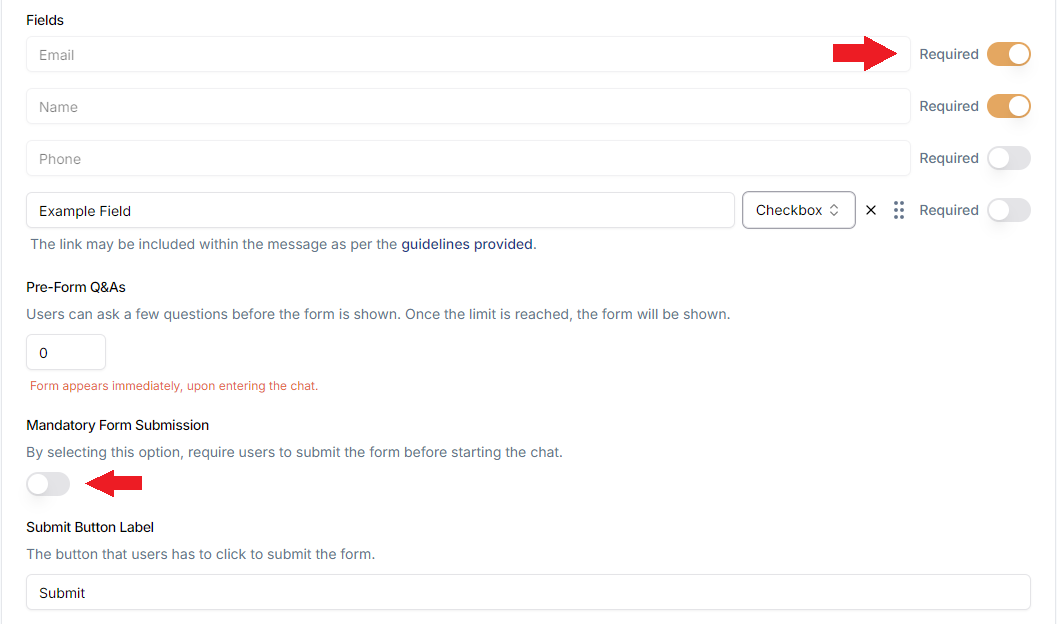 Sie koennen bestimmte Felder verpflichtend machen. Wenn mindestens ein Feld verpflichtend ist, erhalten Sie zudem die Moeglichkeit, das gesamte Formular verpflichtend zu machen, bevor der Benutzer weiter chatten darf.