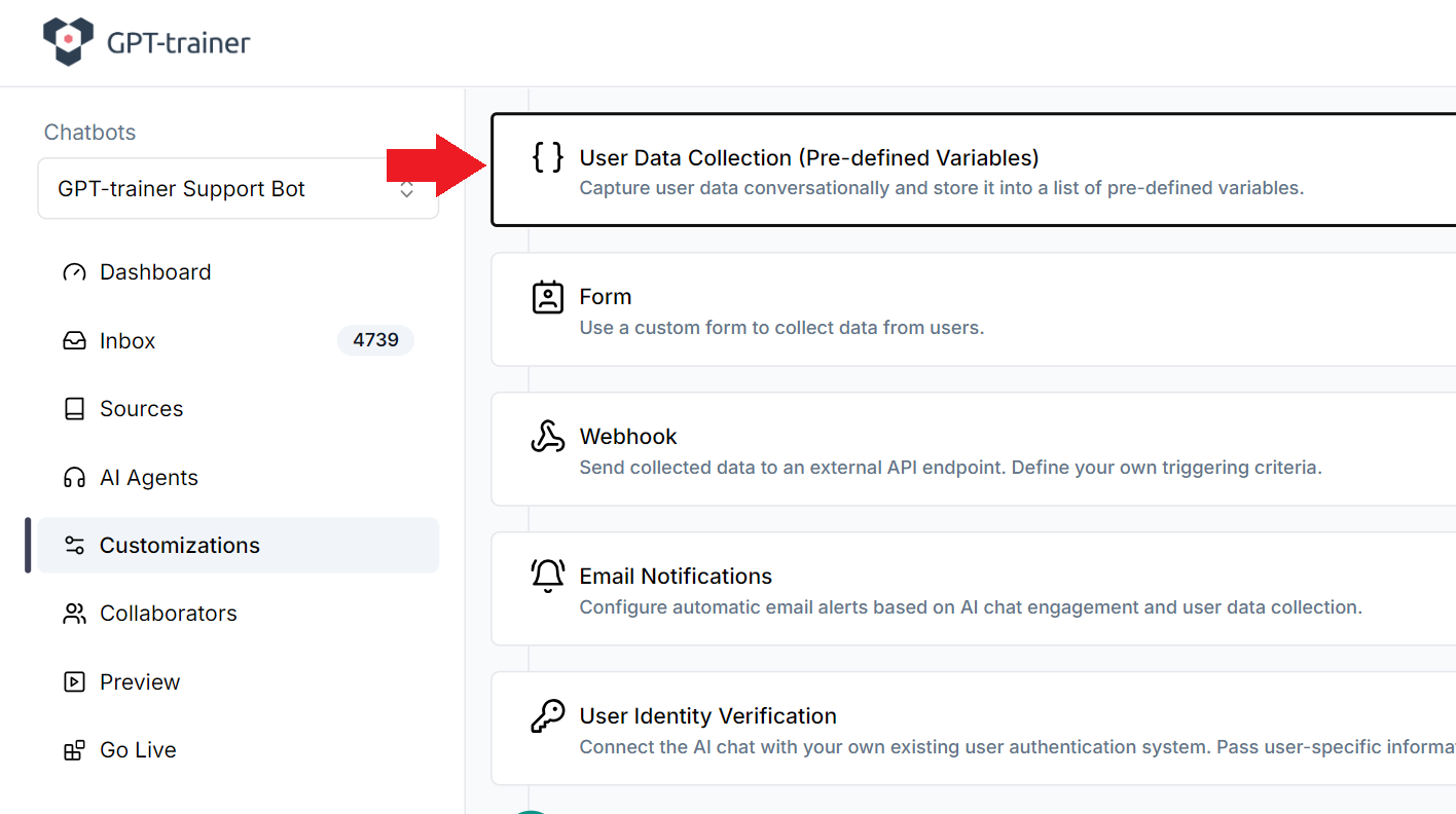 Gehen Sie zum Tab Customizations in der rechten Seitenleiste und scrollen Sie nach unten zu User Data Collection.Klicken Sie darauf, um den Bereich zu erweitern.