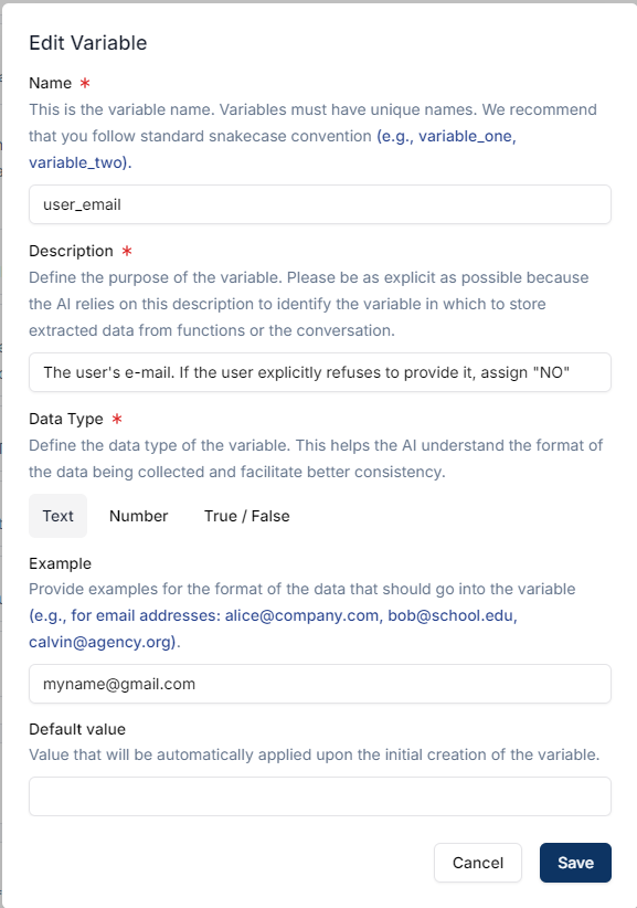 Geben Sie bei der Einrichtung einer Variablen unbedingt einen Variablennamen, eine Beschreibung und Beispielwerte an.