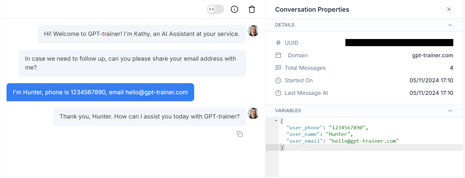 Im Beispiel oben wären dies Name, Telefonnummer und E-Mail-Adresse. Nachdem alles eingerichtet wurde, koennen Sie den AI-Chat im Vorschau-Modus testen.
