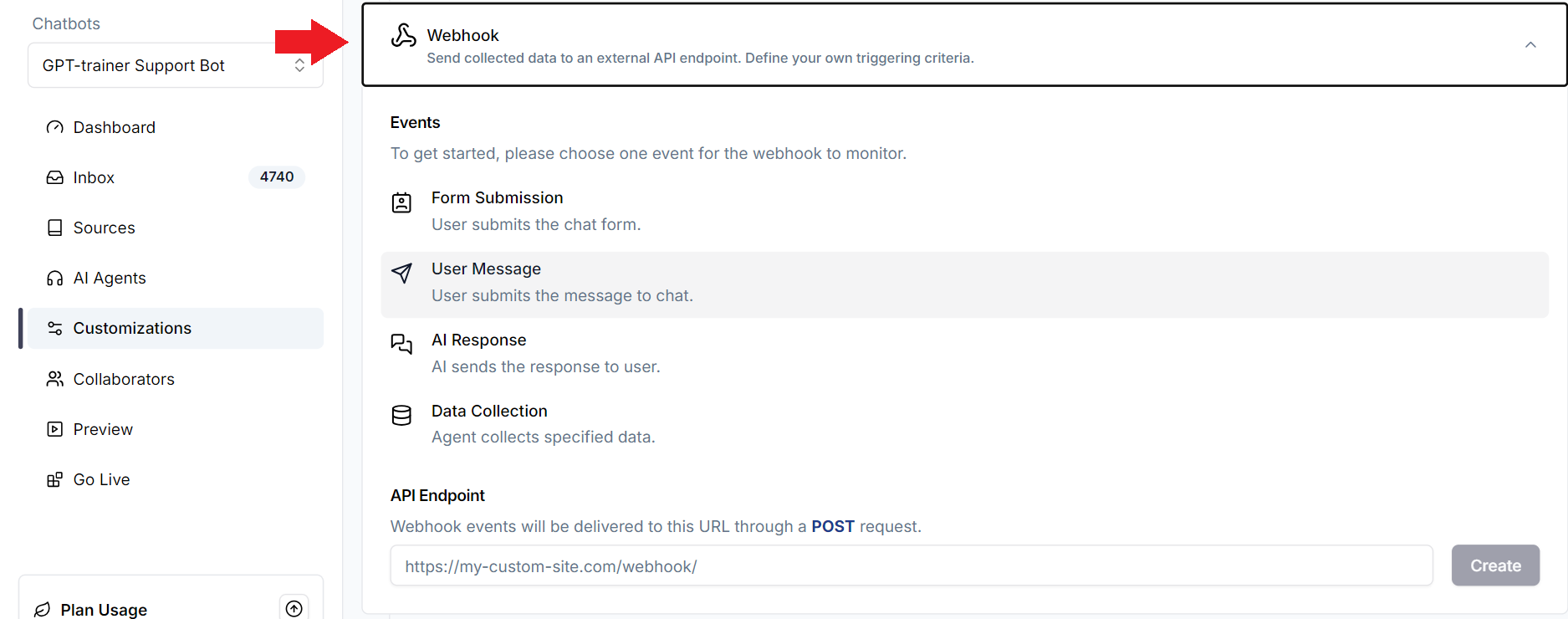 Unabhaengig davon, ob Sie Daten per Formular oder konversationell sammeln, moechten Sie diese moeglicherweise an ein CRM-System weiterleiten.INNOCHAT unterstuetzt Webhooks mit intelligenten Triggern, die Sie automatisch ueber neue Leads informieren. Gehen Sie im linken Navigationsmenue zum Tab Customizations und scrollen Sie dann zum Abschnitt Webhook.