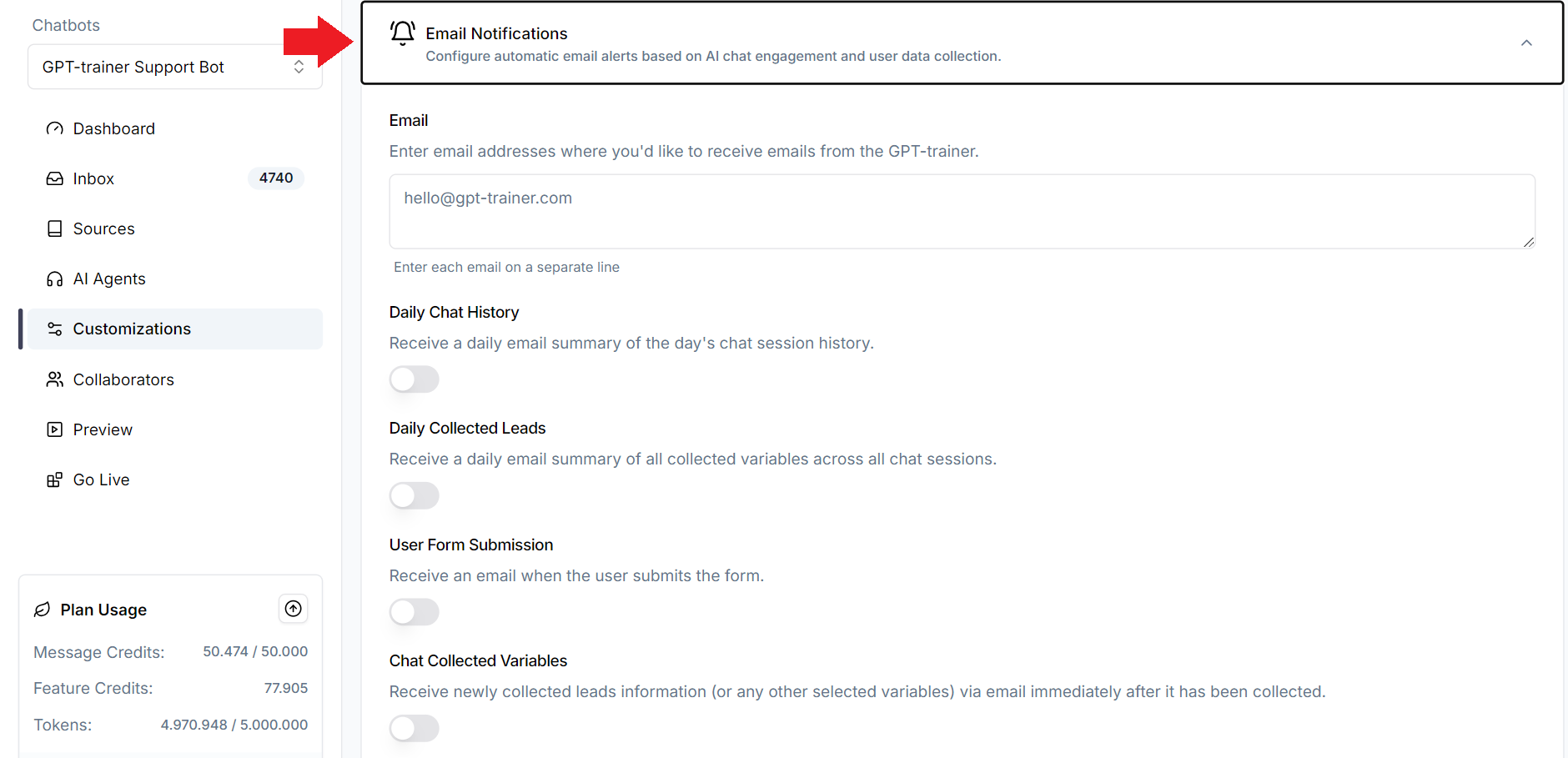 Wenn alles korrekt funktioniert, sehen Sie die gesammelten Daten in Ihrem Posteingang, sobald ein Benutzer bedeutungsvoll mit Ihrem AI-Chat interagiert.