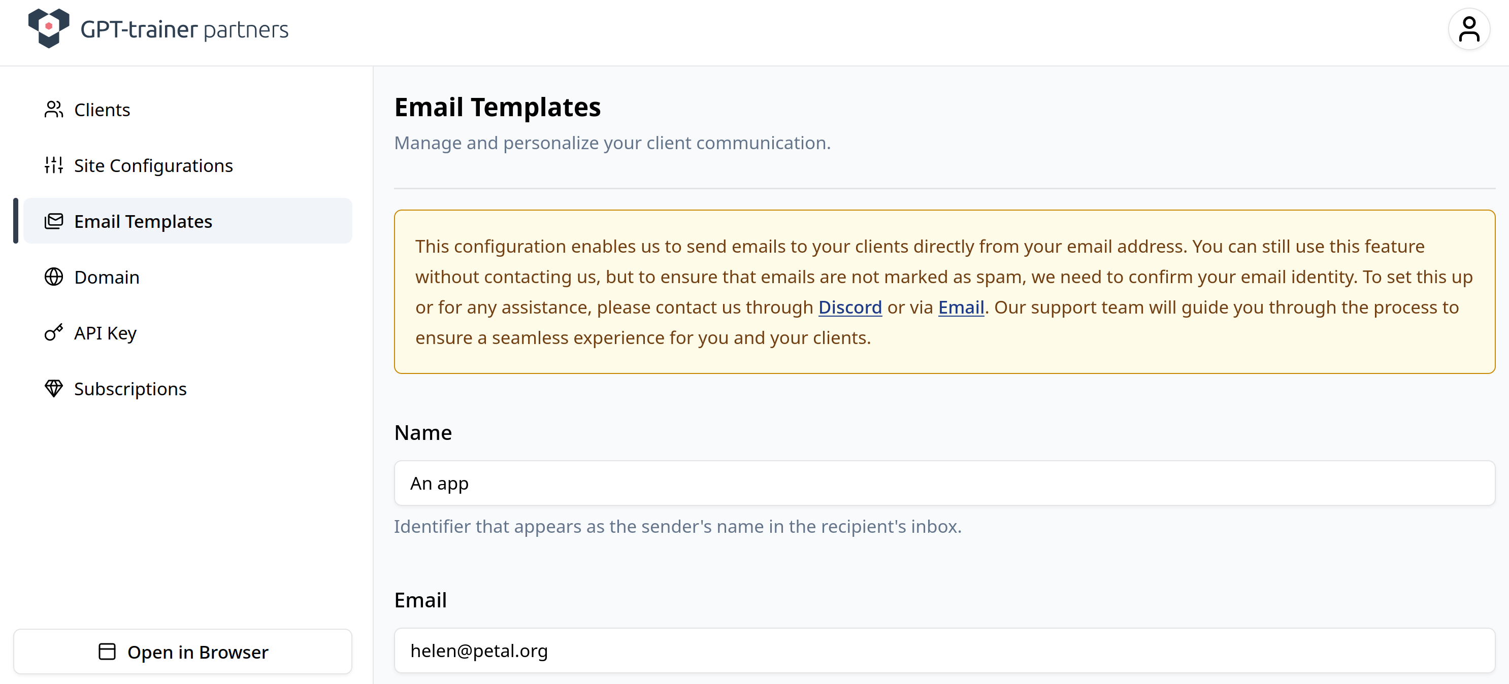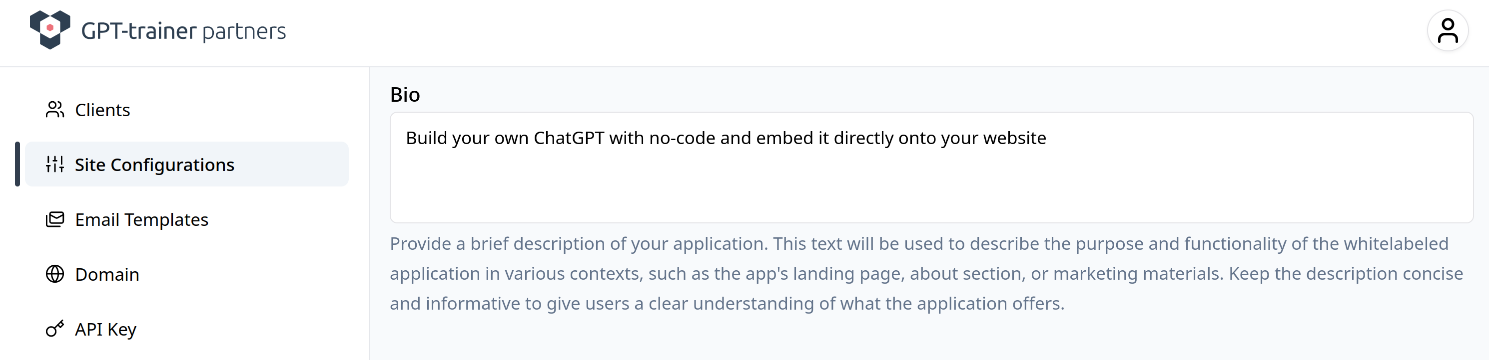 Unter dem Tab „Site Configurations“ im linken Menü kannst du die benutzerseitigen Informationen deiner App ändern, darunter:- Der Name deiner App