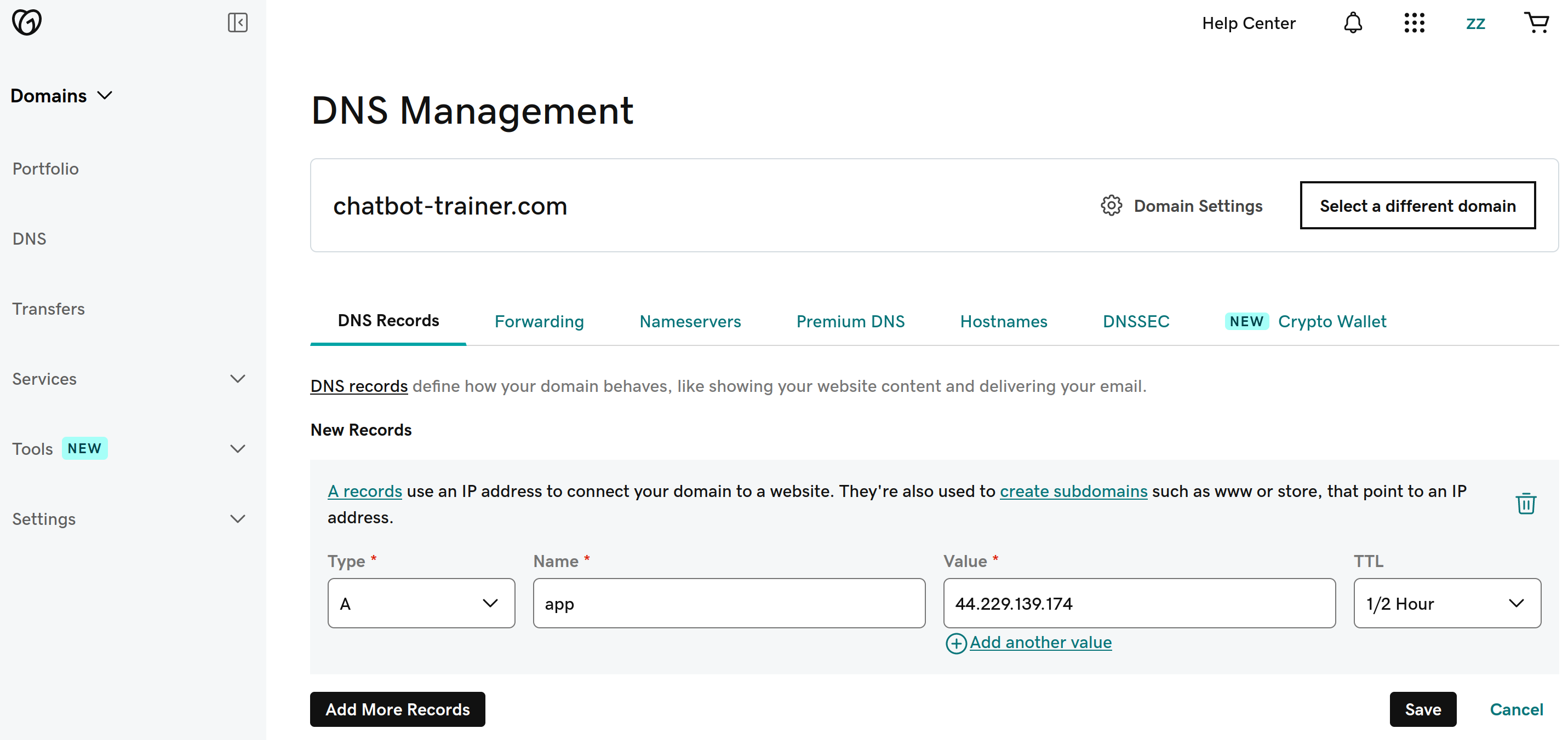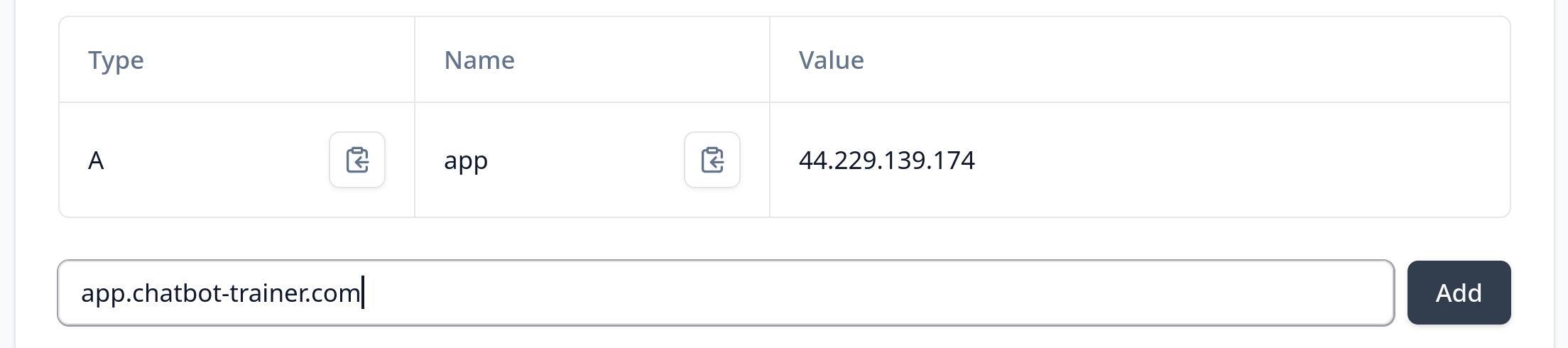 Für diesen Schritt musst du bei deinem Domain-Provider einen DNS-A-Record hinzufügen, der auf die im Tab „Domain“ bereitgestellte IP-Adresse zeigt. Du kannst entweder die Root-Domain oder eine Subdomain verwenden.Beispiel: Soll deine App unter